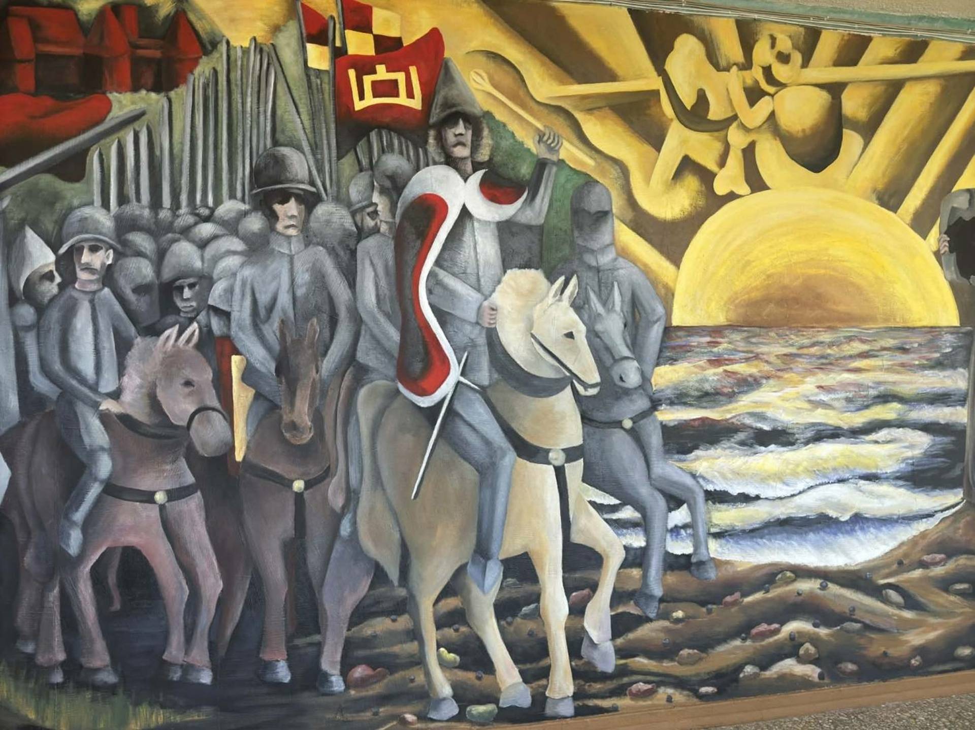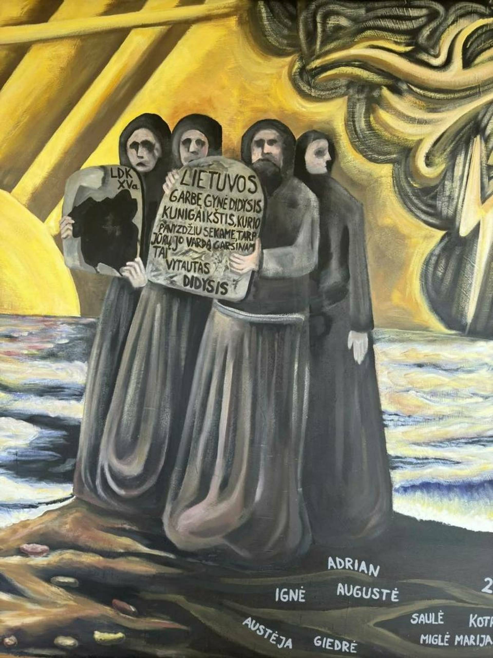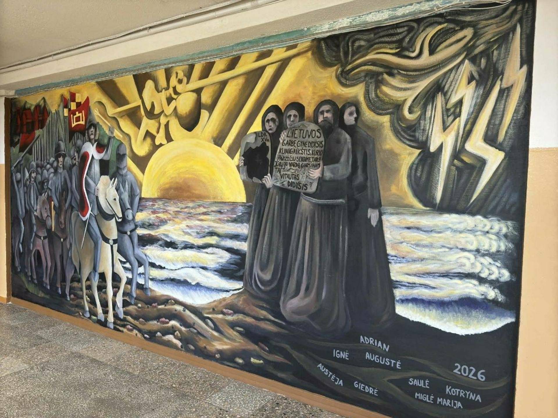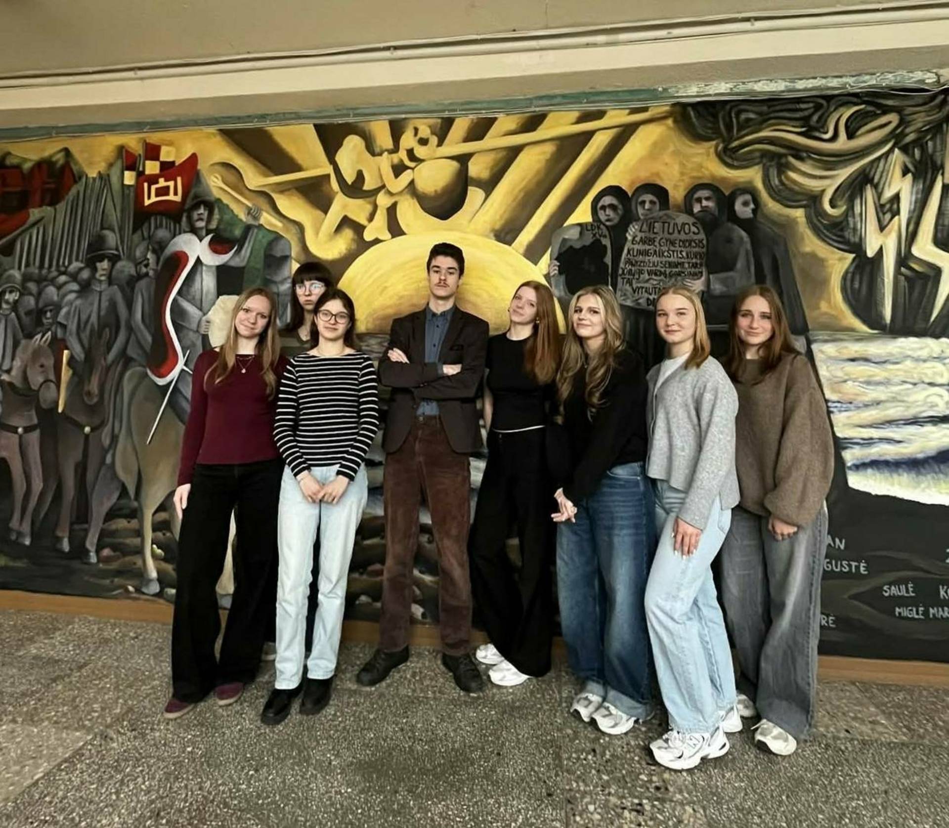 The student-initiated project “On the Paths of Vytautas the Great” was implemented at Vievis Gymnasium. Its authors are the chairman of the student council, Adrian Pavlov, and the technology teacher, Rytis Šakys, together with a creative team of students: IA class student Giedre Alaburdaite, IB class students Migle Marija Važnevičiūtė and Kotryna Čižaite, IIA class students Austėja Protusevičiūtė and Auguste Perednytė, and IIC class students Igne Grybauskaitė and Saule Šiaulytė. The project involved the renovation of one of the walls of the gymnasium on the second floor, next to the teachers’ room and history room. Until now, this place had been decorated with a fresco painted by the 1999 graduates, but the student council members, together with the technology teacher, proposed to renovate it, giving the space a new visual and symbolic meaning. The main motif of the work is Vytautas the Great’s journey to the Black Sea. The mural symbolizes the greatness, pride and honor of Lithuania, earned through great deeds, and at the same time it is a metaphor for travels, searches and goals achieved through efforts. From an idea and sketches, the project gradually turned into reality - a team of students, devoting their time even during the holidays, consistently worked on the implementation of the mural. The new mural not only decorates the gymnasium space, but also reminds of important values - Lithuanianness, respect for history and the desire to create and improve
